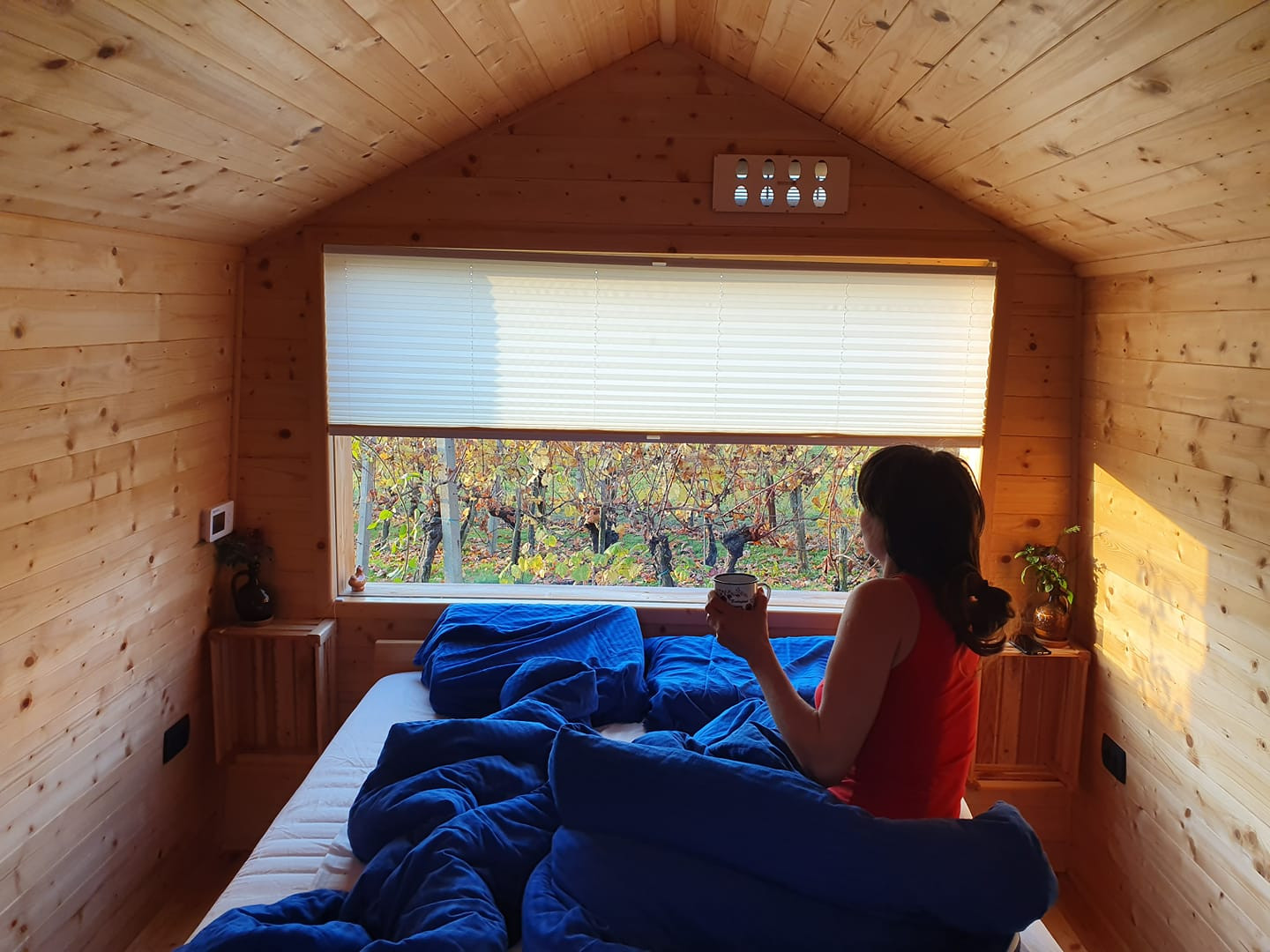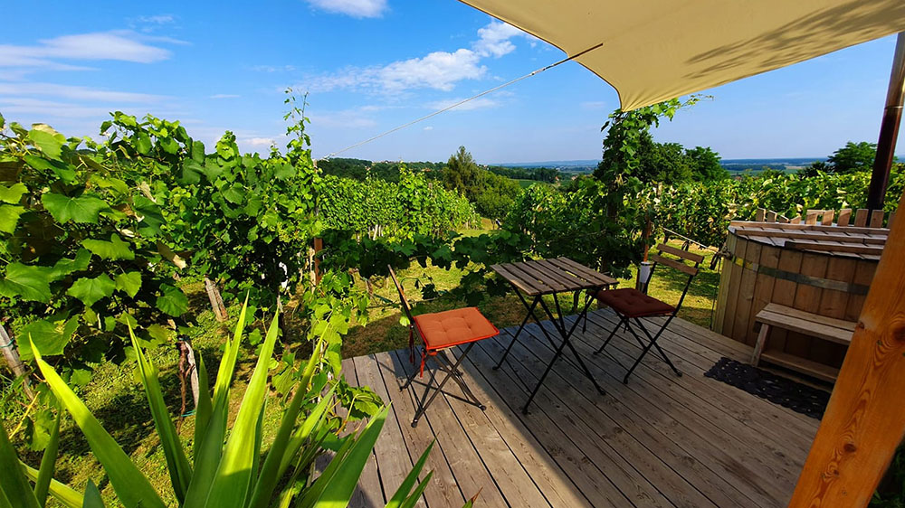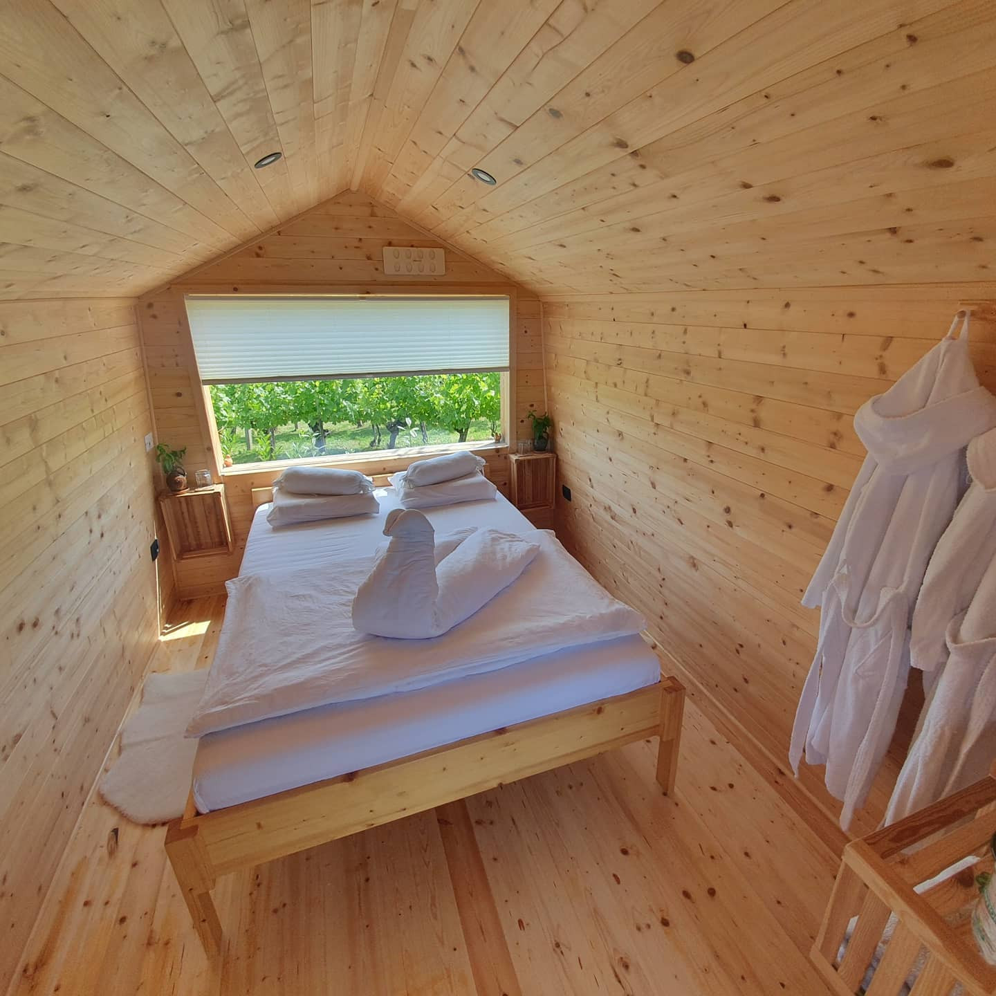V glampu na bregu sredi vinograda boste prenočili v moderni leseni hiški iz smrekovega lesa iz sibirskega macesna.